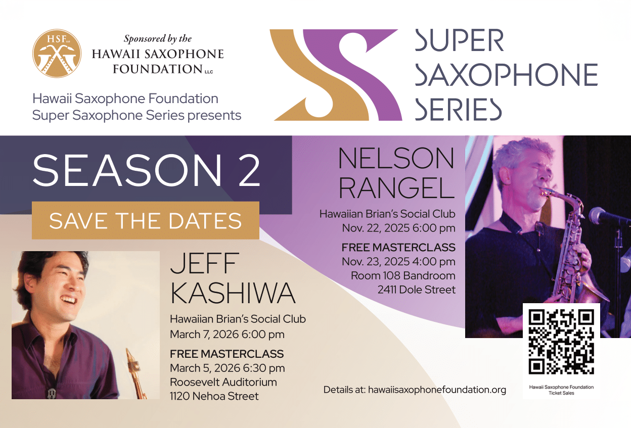 But the excitement doesn’t stop there! On Sunday, November 23rd at 4 PM, Nelson Rangell will lead a free Masterclass Jazz Clinic at the UH Manoa Bandroom. Presented by the Hawaii Saxophone Foundation in collaboration with the UH Department of Music, this clinic offers a rare opportunity for aspiring musicians and jazz enthusiasts to gain insights and techniques from one of the genre’s true legends. The session is open to all musicians and jazz lovers eager to deepen their understanding and appreciation of jazz.